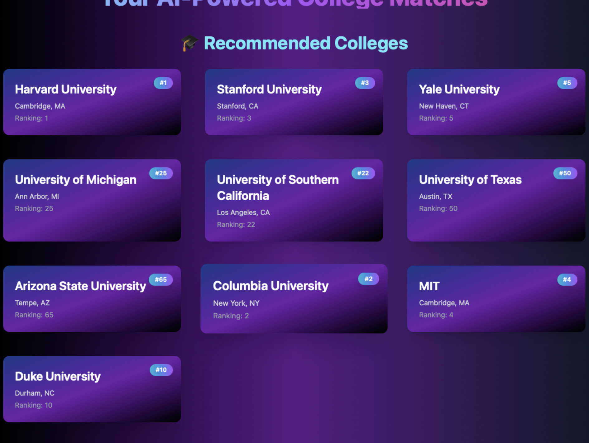 - Designed a college match platform using machine learning, speech-to-text, and a Siri-style accessibility interface
